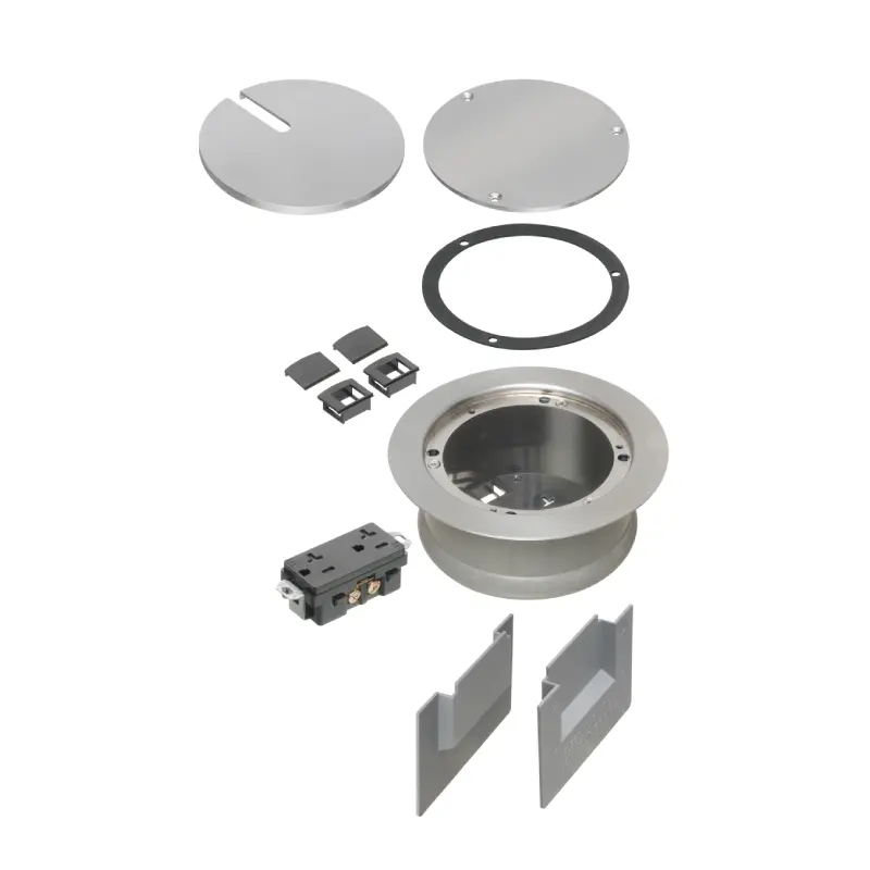 Two low voltage openings. Ultra-thin stamped steel nickel plated flange cover, flush-to-floor in-use and blank cover. Installed UL Listed 20A tamper-resistant decorator-style receptacle.