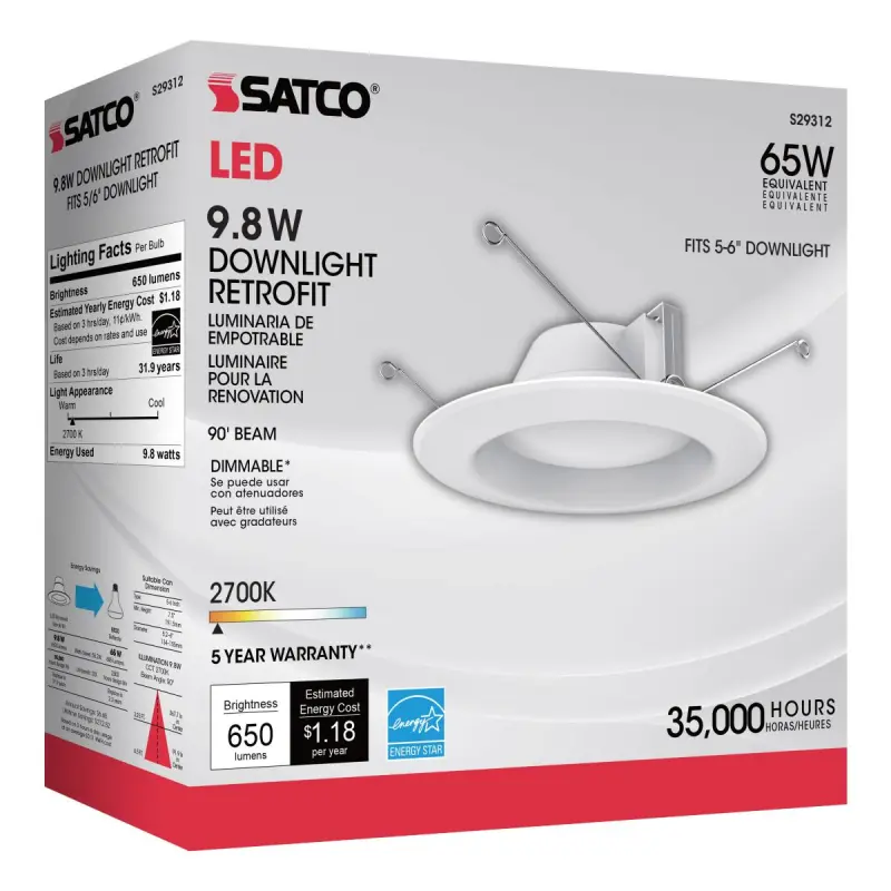 Satco S29312 – 9.8 watt LED Downlight Retrofit; 5 – 6″; 2700K; Dimmable; 120 volts