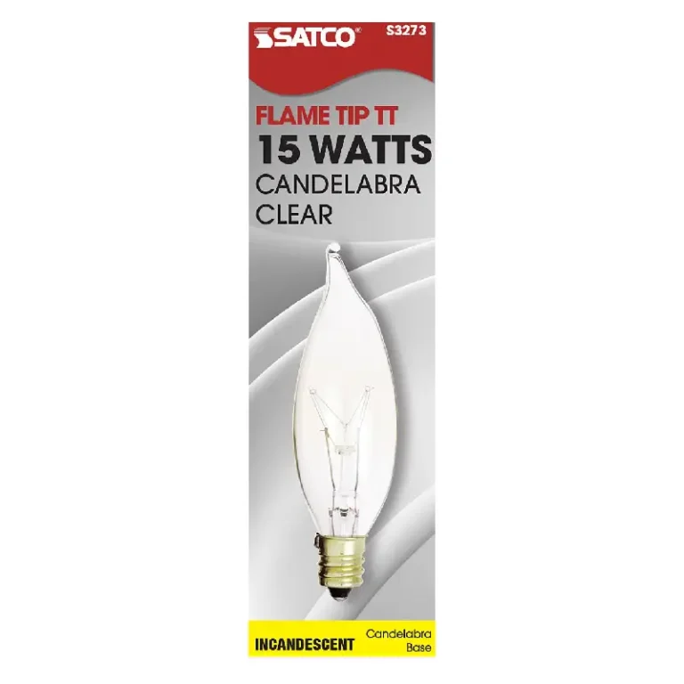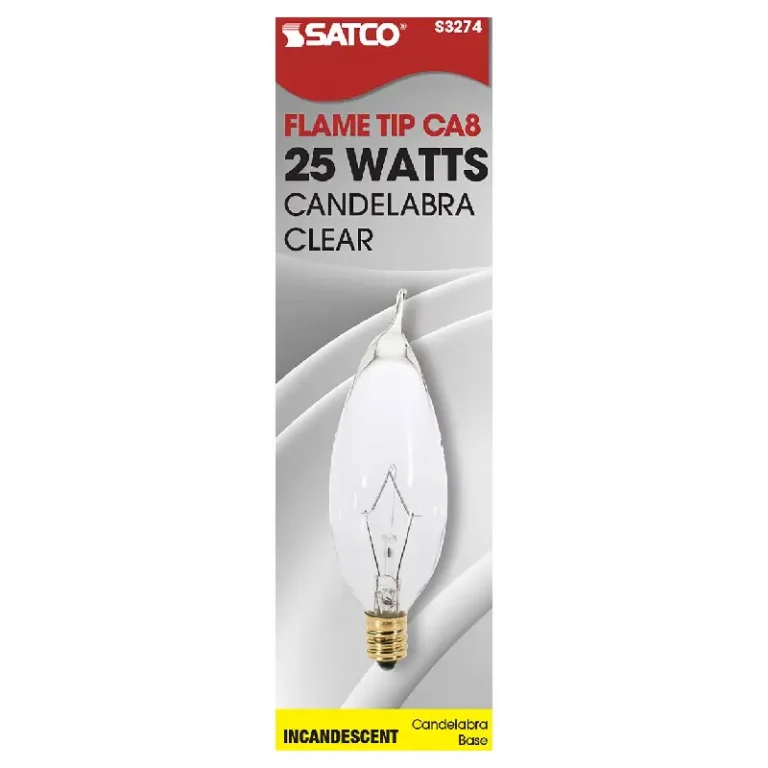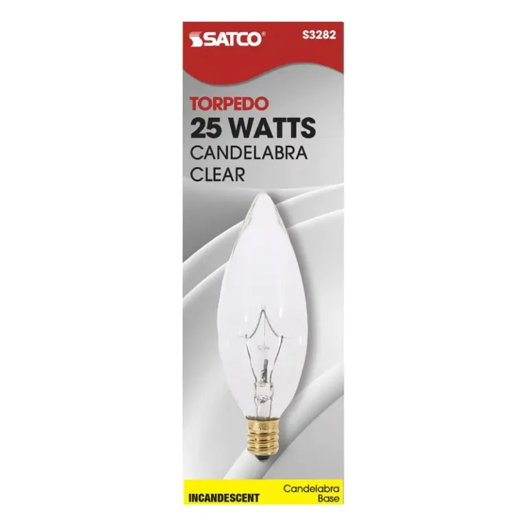 Satco S3282 25 Watt BA9 1/2 Incandescent; Clear; 1500 Average rated hours; 212 Lumens; Candelabra base; 120 Volt